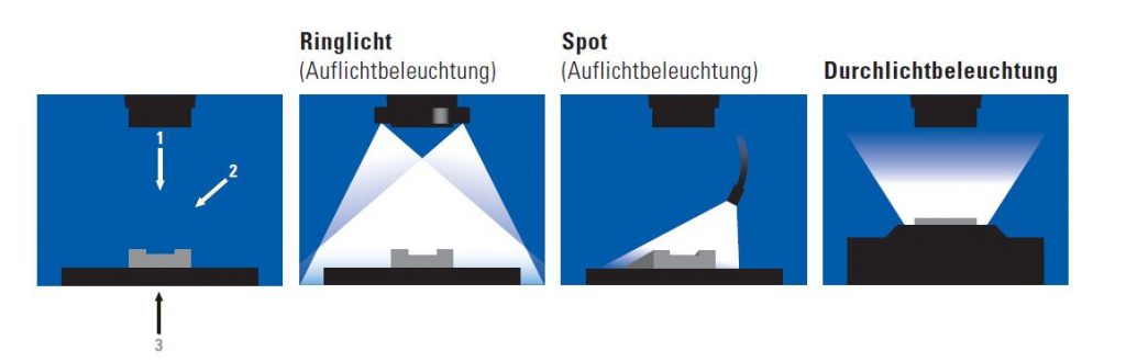 Für den gewünschten optimalen Bildkontrast werden drei Ansätze angewendet: Auflicht (mit Ringlicht [1] oder Spot [2], bietet höchste Lichtintensität bei maximaler Flexibilität und größter Auswahl an Beleuchtungen) und Durchlicht [3].